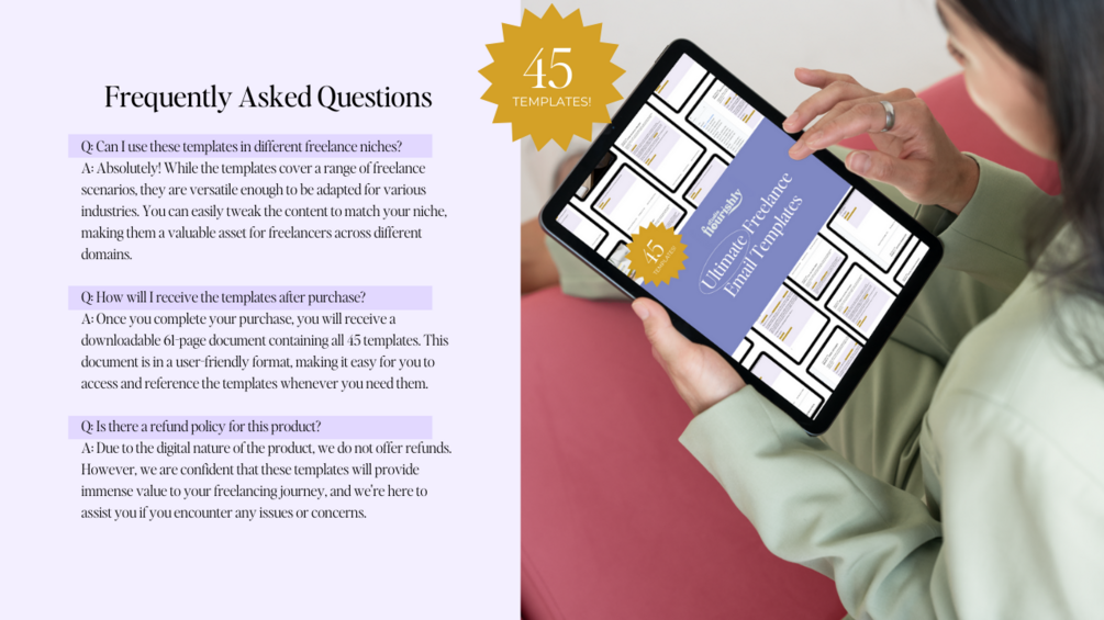 A: These templates are designed to save you time and effort when communicating with clients. Whether you're dealing with pricing concerns, contract negotiations, project deliveries, or any other freelance scenario, the templates offer you professionally written responses that you can customize to match your unique style.